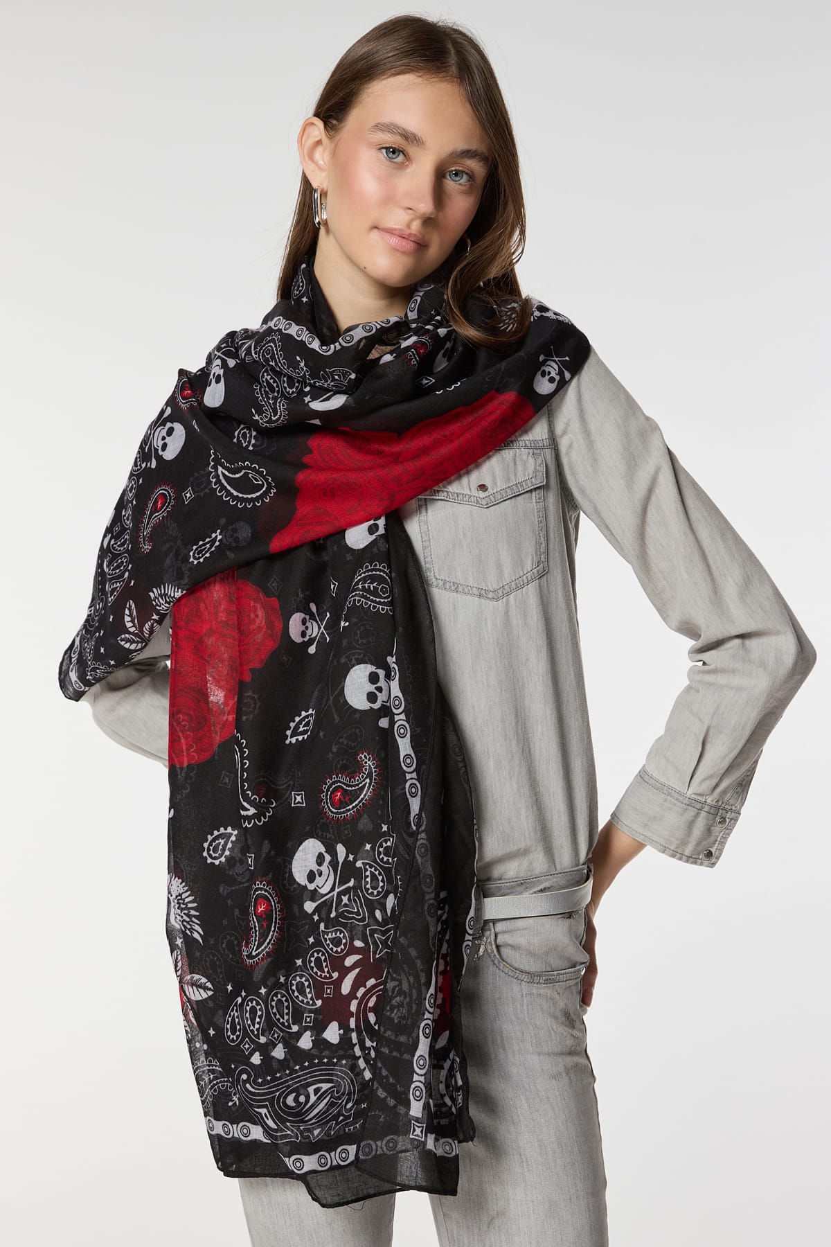 Kırmızı Gül Detaylı, Desenli Gothic Şal, Kışlık Sıcak Şal, Yumuşak Kalınlaştırılmış Pamuk Şal/Boyunluk/Atkı , Kalın Ekstra Trend Şal